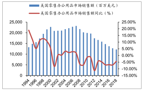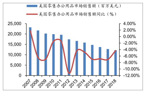 美國傳統零售辦公用品銷售額自2008年逐年縮減