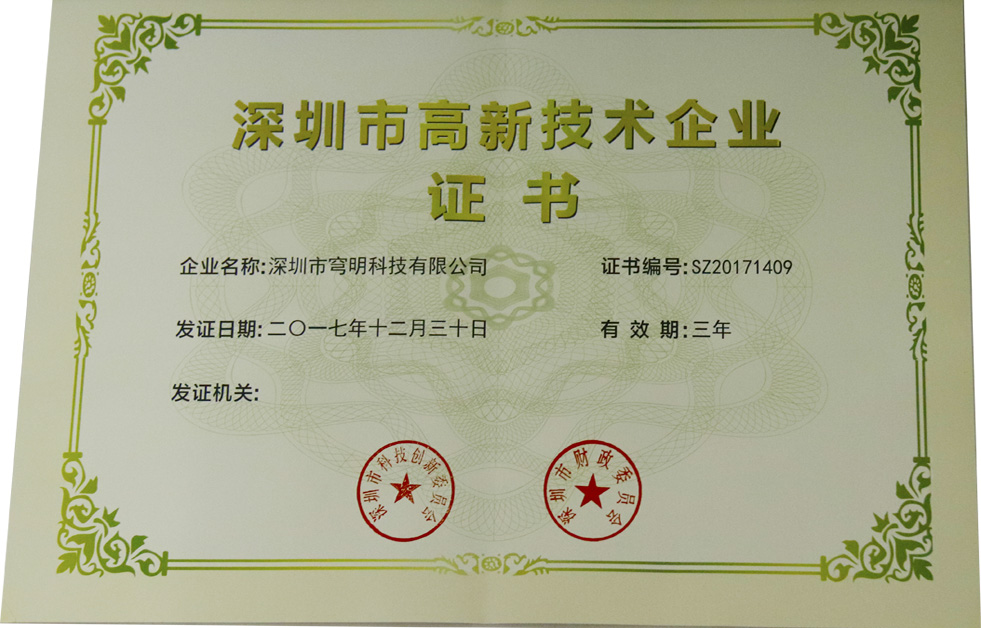 依據(jù)《深圳市高新技術(shù)企業(yè)認定管理辦法》的規(guī)定,深圳市科工貿(mào)信委、市財政委組織專家,經(jīng)過層層嚴格的審查,我司憑借優(yōu)秀的研發(fā)實力和創(chuàng)新能力,通過深圳市高新技術(shù)企業(yè)認證。