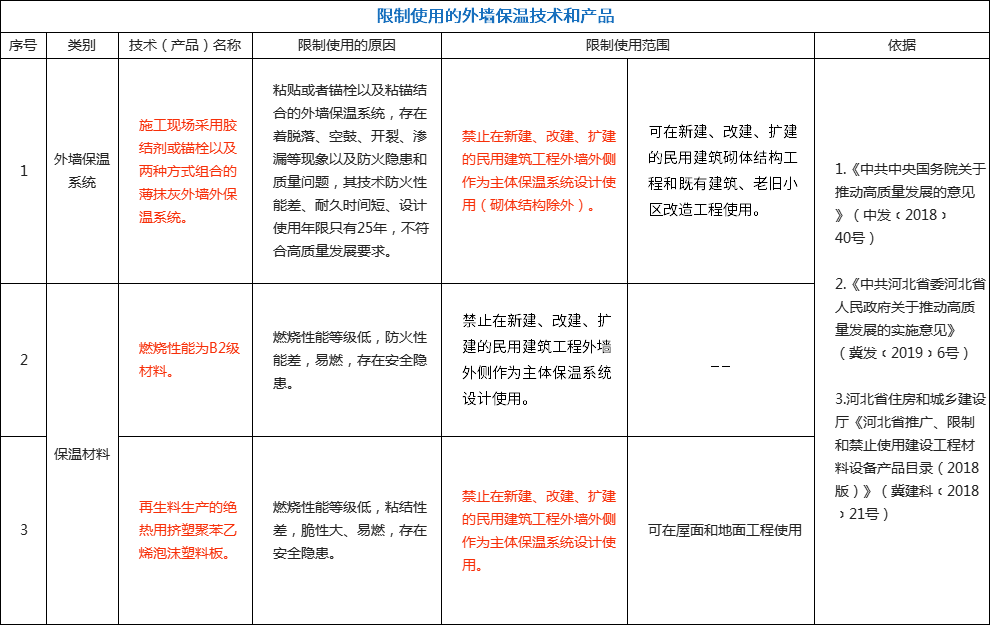 禁止使用范圍:禁止用于新建的住宅、公共建筑工程的外墻外側(cè)作為主體保溫系統(tǒng)設(shè)計(jì)使用。