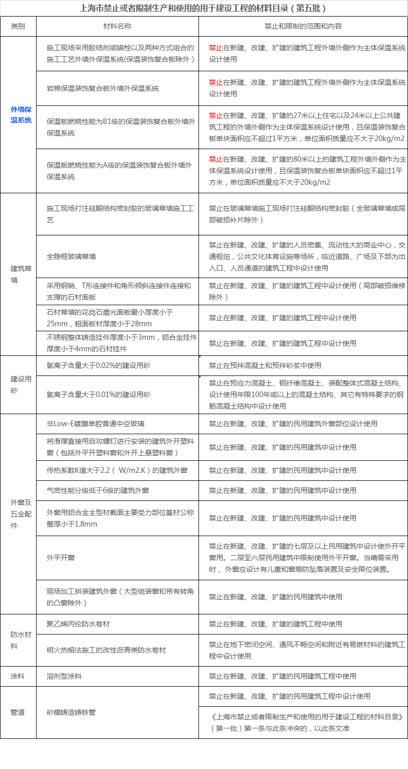 上海市住房和城鄉(xiāng)建設(shè)管理委員會公布了《上海市禁止或者限制生產(chǎn)和使用的用于建設(shè)工程的材料目錄(第五批)》。