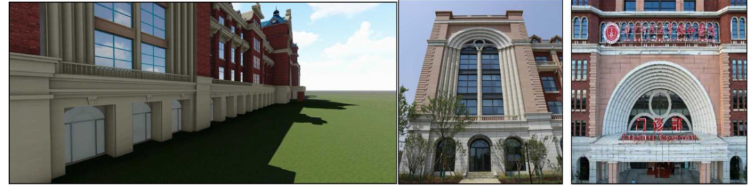 外立面采用正統的英式古典復興風格,造型復雜,由石材、軟瓷、仿石鋁板、 GRC構件、西式陶瓦等多種材料拼接和結合,多種材料交替使用,界面清晰,線條順直, 曲線圓滑;西式陶瓦、坡屋面、幕墻等建筑手法的巧妙運用,賦予建筑獨特的韻律和美感。