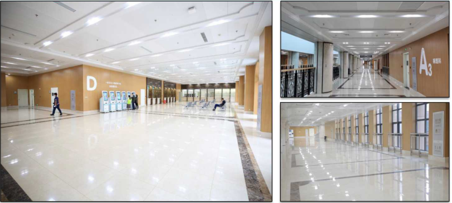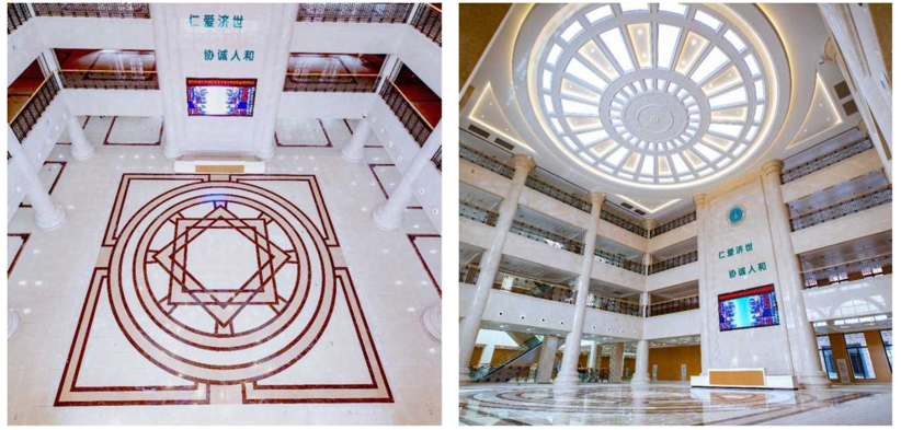 門診大廳采用多層圓形GRG吊頂,質量輕、不變形、安全性好、防潮、防火、阻燃性能好,屬綠色環保材料類,造型豐富,聲學效果好,加工周期短,施工便捷、品質穩定,裝飾效 果凸顯大氣,整體風格協調,與地面拼花上下對中,天地相應。