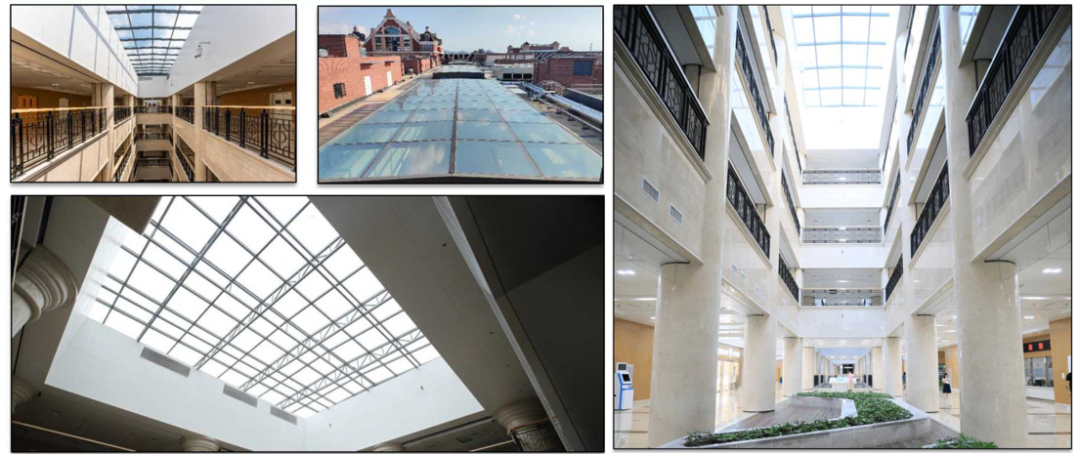 主體結構內堅外美,梁柱節點棱角清晰。本工程在管線集中的公共區域,在結構設計階段就提前考慮了降低主體成本和空間優化在醫療街部位首次采用了9500m2雙向密肋梁樓蓋板,采用成品塑料模殼作為胎模,有效減少了樓板的混凝土量與樓板自重;增加室內凈咼與柱網跨度,在標準層咼范圍提咼了各專業吊頂內施 工空間,整體性能好、剛度大、抗震性能好;同時還起到隔聲、隔熱的作用,以不增加造價和實用性為選用原則。