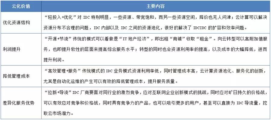 對于傳統(tǒng)IDC提供商來說,只提供基礎(chǔ)設(shè)施增值空間有限,同時(shí)也無法適應(yīng)逐漸復(fù)雜的云環(huán)境,同時(shí)云計(jì)算的發(fā)展也使得IDC面臨更加復(fù)雜的競爭。云服務(wù)商的興起,使得IDC云化成為必然趨勢,下圖是IDC云化的優(yōu)勢: